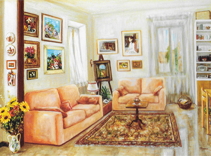 Interno con divani rosa, 2001,olio, 95×75