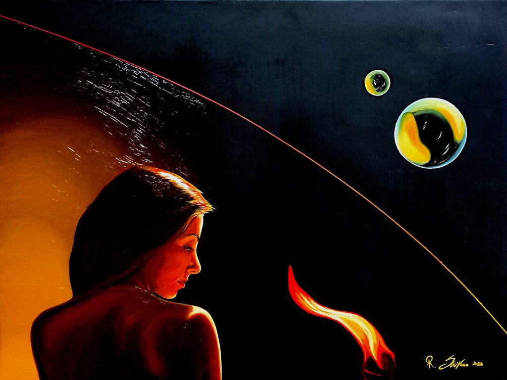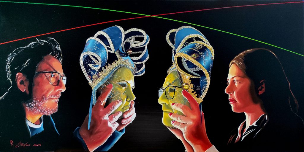 Questa in oggetto è composizione poetica di alto livello esecutivo. Rosario Scrivano ha saputo realizzare un dipinto emblematico assai importante a livello di messaggio universale. Il contrappunto perfetto tra le due figure di donna e la significativa maschera in basso a destra, nasce grazie allo splendore del raffinato costrutto cromatico, che pienamente risponde allo struggente titolo dell’opera.