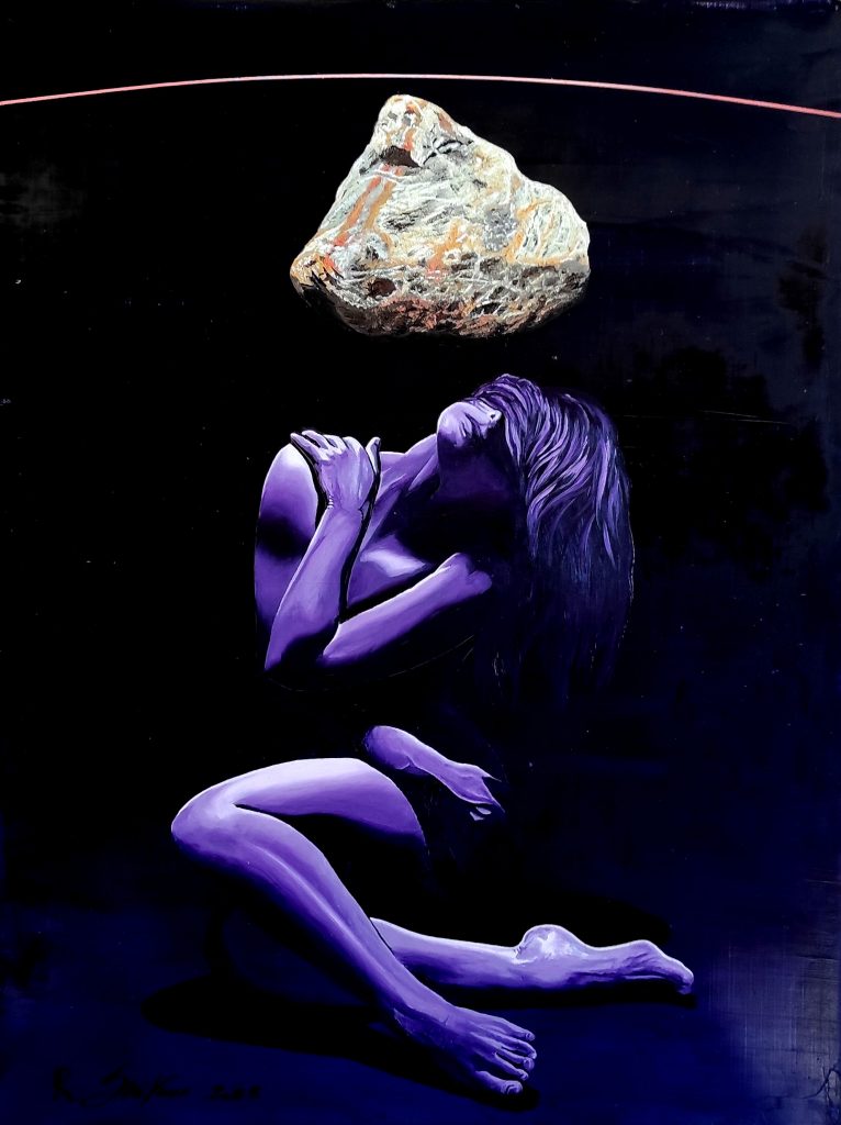 Perché il suo viaggio esplorativo, è cominciato da molti quadri di incredibile purezza, nei colori squillanti, timbrici, intrisi di luce naturale. Ad apprezzare la inquieta icasticità del rappresentativo, compendiando col pensiero intelligente, finchè altri particolari ossessivamente insistiti, gli hanno rivelato senza più incertezze che, con il carattere tormentato del suo innato talento, mirato alla ricerca esplorativa del profondo interiore, all’intrinseca natura del pensiero, oltre ogni possibile ragione, la variabilità nei livelli acquisiti di visualizzazione, la scoperta di momenti variabili dell’identità, il metamorfico caleidoscopico mondo del sogno, le immagini sempre nuove della natura che lo circonda, nei diversi aspetti che acquistano differenti significato, la complessità della centralità della persona umana, il paradosso che attizza il testo di molti percettivi dell’intuizione, la sua capacità come artista sintomatico, istintivo, quant’è potenzialmente analitico, per un bisogno di risultanze estreme, da godersi in sé. Per il suo metamorfismo deflagrante, surreale della figura femminile, il nocciolo dell’arte che libera come nella natura, un potenziale di apocalisse, per il metamorfismo deflagrante ma ordinato in stratificazioni dei differenti livelli della visione dell’apparenza…